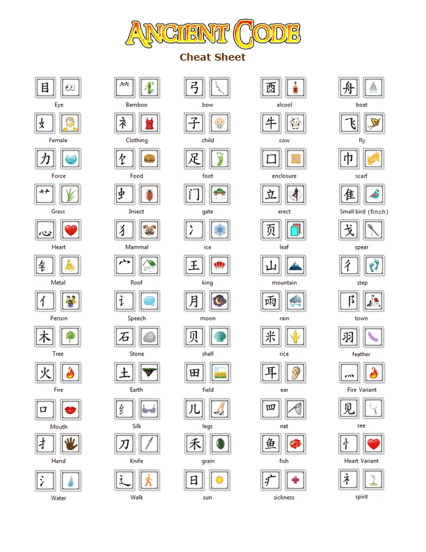 This is the cheatsheet for the Chinese learning game Ancient Code by LittleNex. Learn the 60 most common Chinese radicals used in identifying Chinese characters! Play the FREE version of the game or join us and get the full version!